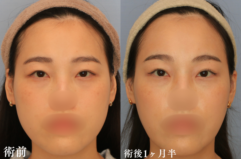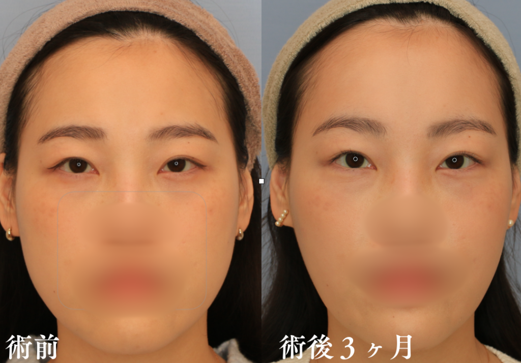 前額の引き上がり、眉の位置は術後1ヵ月以降は大きな変化はありません。術後1年経過していますが、後戻り等なく順調な経過です。