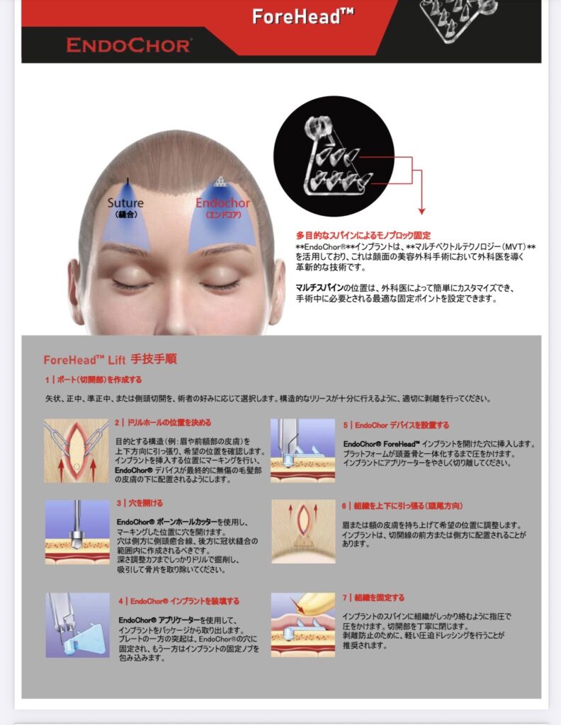 エンドコアは内視鏡前額リフトに使用するデバイスです。剥離して引きあげた皮膚・皮下組織を引っかけて戻らないよう固定します。体内に完全に吸収されるため抜去の必要がありません。